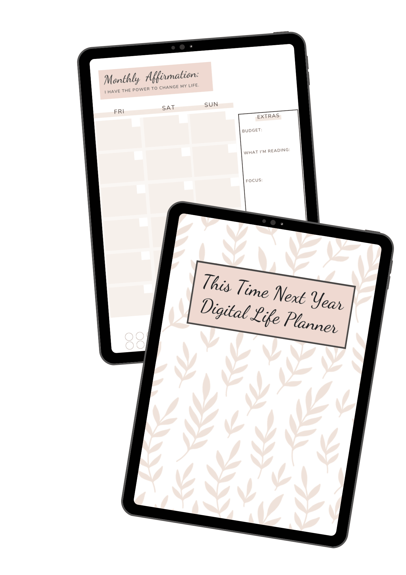 The This Time Next Year Digital Life Planner is designed to be your must-have sidekick throughout your This Time Next Year Challenge. It has everything you need to keep you organised and it's packed with worksheets, activities, and trackers so you can level up your life in the next 365 days.
